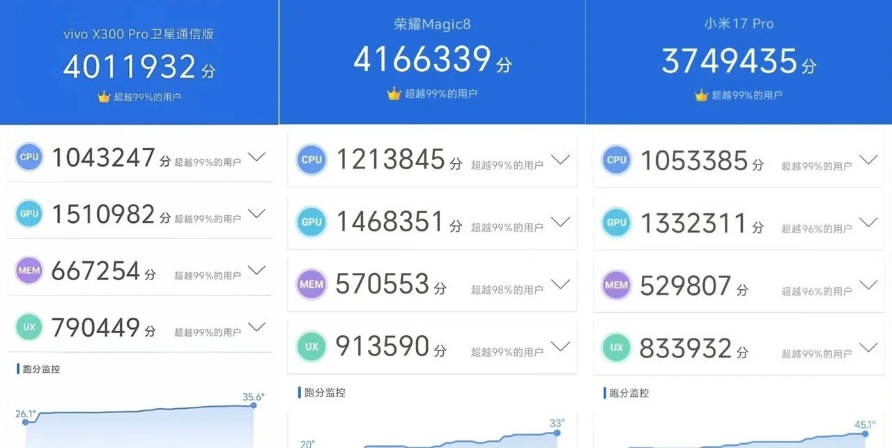 其中,荣耀Magic 8跑分达到416万分,表现明显领先;vivo X300 Pro目前测得401万分,但尚未正式上市,成绩仍有调整空间;小米17 Pro则录得374万分。